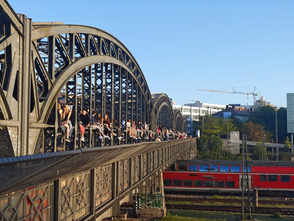 One of the Hackerbrücke’s greatest features and reasons for its popularity is the spectacular sunset view . Especially in summer, when the sun sets late, people from all over Munich gather here – students, travelers, couples, groups of friends. They sit on the bridge’s steel girders, bringing their own drinks and sometimes food. Thanks to the steel girders, you can climb up onto the Hackerbrücke and find a comfortable spot to sit. There, you can simply enjoy the view. You have a direct view over the railway tracks, the city in the background, and the sunset right in front of you. The light then falls golden on the steel rails – a truly magical moment in the heart of Munich.